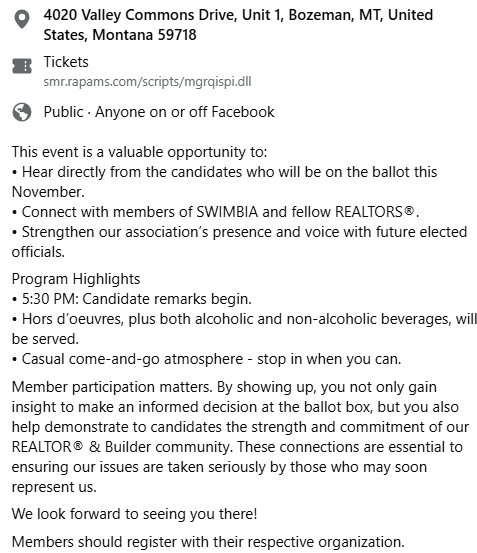 This candidate meet n greet is a collaborative event with Southwest Montana Realtors (SMR or formerly GAR).